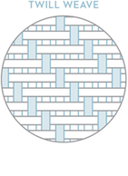 Twill weave is often a one-thread-over, three-threads-under pattern and produces a diagonal rib line on the face of the fabric. Twill fabrics are strong, durable, and used to create bedding with a soft, beautiful drape.
